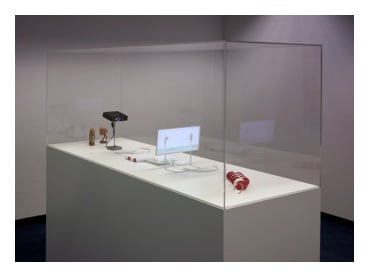 Videoprojektion, Holz, Farbe, Metall und Textil auf Sockel, Vitrine, Videostativ und kleinem Projektionsobjekt, 125 x 32 cm