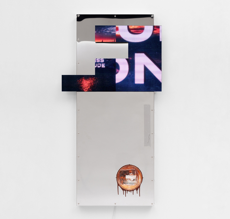 LED matrix screen, video loop, 2’ 15’’, stainless-steel mirror, acrylic glass, photo print and adhesive tape, 152 x 77 x 13 cm