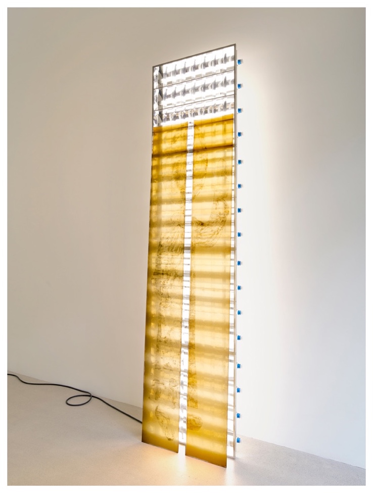 aluminium, fluorescent tubes, glass, latex, transfer printing, cables and ballast, 228 x 60 x 40 cm