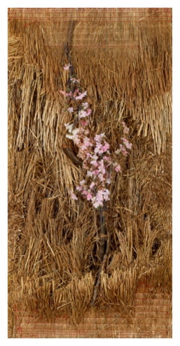 tatami mat, plexiglass, medex, branch, cherry blossom, linseed oil, thread, fabric, oil stick and nails, 182 x 92 x 15.5 cm