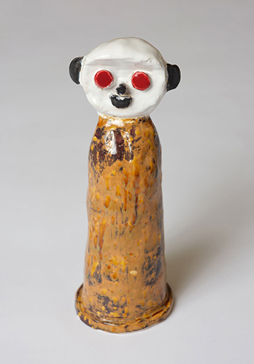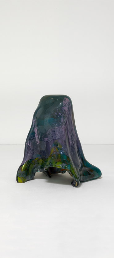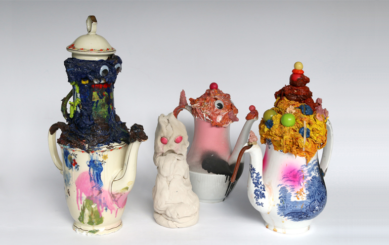 oil, spray, glitter, chewing gum on teapot, height (from left to right): 35 cm, 19 cm, 22 cm, 30 cm; I refuse to sink (second from left), 2015, clay and chewing gum