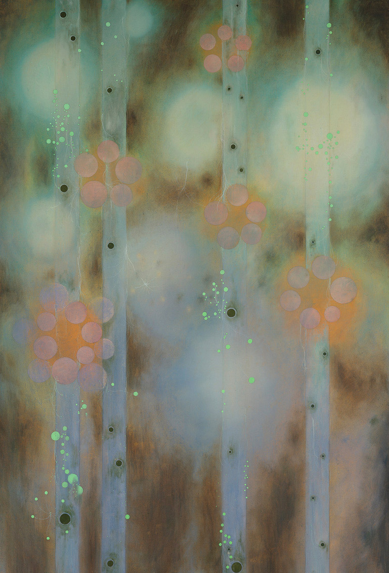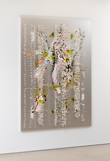 oil, acrylic, collagen, graphite and thread on hand-tapped aluminium, 175 x 125 cm