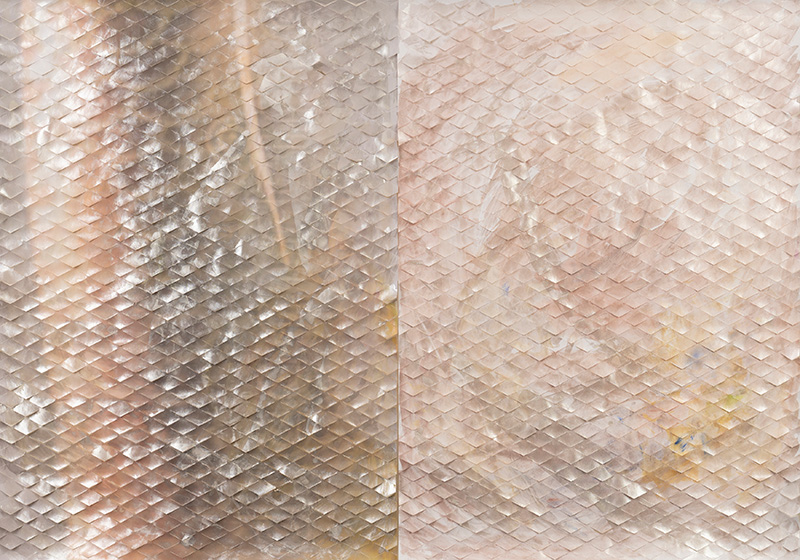 natural pigments, acrylics and oil paint on PVC, mirror, wood and PMMA, 208 x 149 x 7.5 cm