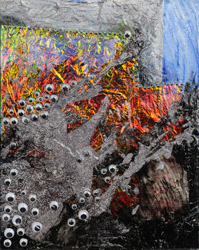 cellophane, oil, googly eyes, acrylic glitter, napkin and epoxy on linen, 50 x 40 cm